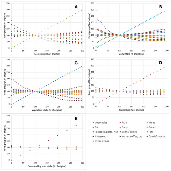 Impact of changes in the amount of meat (A), dairy (B), vegetables (C), fruit (D), or beans and pulses (E) on the amount to which different food groups are included in optimized nutrient-adequate diets. Both changes in food groups and outcomes are expressed as a percentage of levels in the original diet.