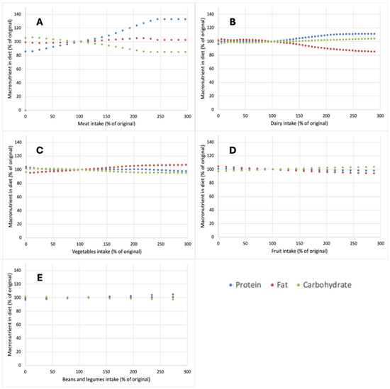 Impact of changes in the amount of meat (A), dairy (B), vegetables (C), fruit (D), or beans and pulses (E) on the amount to which the macronutrients protein, fat, and carbohydrate are included in optimized nutrient adequate diets. Both changes in food groups and outcomes are expressed as a percentage of levels in the original diet.