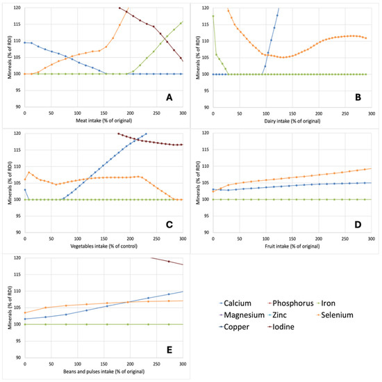 Impact of changes in the amount of meat (A), dairy (B), vegetables (C), fruit (D), or beans and pulses (E) on the amount to which the minerals are included in optimized nutrient-adequate diets. Changes in food groups and outcomes are expressed as a percentage of levels in the original diet whereas mineral levels are expressed as a percentage of the RDI of the minerals. Minerals not visible in graphs were at >120% at all datapoints.