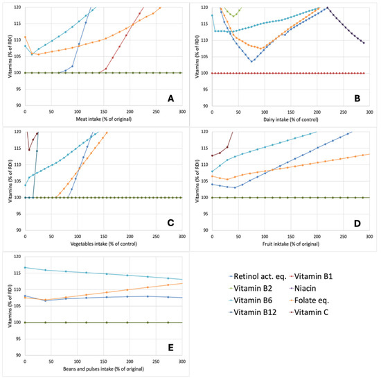 Impact of changes in the amount of meat (A), dairy (B), vegetables (C), fruit (D), or beans and pulses (E) on the amount to which the vitamins are included in optimized nutrient-adequate diets. Changes in food groups and outcomes are expressed as a percentage of levels in the original diet whereas mineral levels are expressed as a percentage of the RDI of the vitamins. Vitamins not visible in graphs were at >120% at all datapoints.