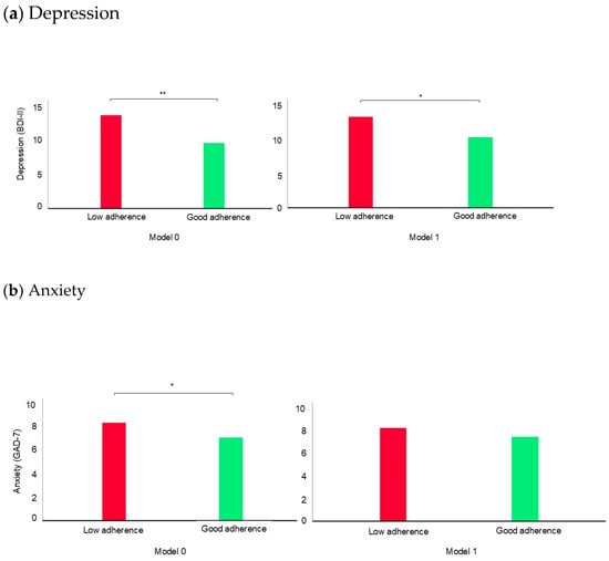 The mean differences between (a) depression (BDI-II) and (b) anxiety (GAD-7) according to adherence to the MedDiet (MEDAS) categories (scores from 9 to 14 indicate good adherence to the MedDiet). Model 0: crude data; Model 1: model adjusted by gender, age, total energy, alcohol consumption, tobacco consumption, level of parental education, lean mass, and MSI. * p < 0.05; ** p < 0.001. BDI-II: Beck Depression Inventory, second edition; GAD: generalized anxiety disorder; EI: energy intake; MEDAS: Mediterranean diet adherence screening tool; MSI: muscle strength index.