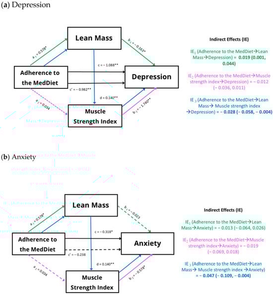 Finally, we performed serial multiple mediation analyses via the PROCESS SPSS macro, version 4.2 [], to determine whether lean mass and MSI act as mediators in the relationships between adherence to the MedDiet (MEDAS score) and depression and anxiety symptoms. For these analyses, we selected a serial multiple mediation model using 5000 bootstrap [] samples to calculate the confidence intervals (95% CIs), with lean mass as the first mediator and MSI as the second mediator. The mediation model used (Model 6 with two mediators) explores the total (c) and direct effects (a1, a2, b1, b2, d, and c′) that indicate the unstandardized regression coefficient and significance between adherence to the MedDiet and depression and anxiety symptoms. Additionally, this model examines three indirect effects (IE1, IE2, and IE3) that indicate the change in depression and anxiety for each unit change regarding adherence to the MedDiet, which is mediated by lean mass and the MSI. The IEs were considered significant when the 95% CI did not contain zero []. The directions of the direct and indirect effects in each mediation model are highlighted with colours.