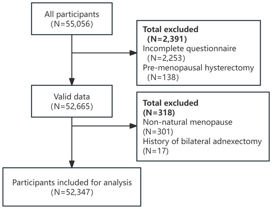The inclusion criteria for participants were non-pregnant women aged 35–60 years, with local residency or having lived in the area for more than 6 months (55,056 participants). Exclusion criteria were incomplete information (2253 participants) and a history of premenopausal hysterectomy (138 participants), resulting in a total of 52,665 data entries, with an effective response rate of 95.6%. Women with non-natural menopause (301 participants) and a history of bilateral adnexectomy (17 participants) were also excluded, leaving 52,347 participants for final analysis. All the participants were required to sign an informed consent form and voluntarily complete all survey content (Figure 1).