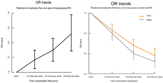 Univariate regression analysis of the impact of protein and nutrient supplements on natural menopause age showed that, compared to those who “never consume”, the consumption of fish, milk, eggs, soy products, vitamin supplements, and calcium supplements was associated with delayed natural menopause. The results of multivariate ordinal logistic regression analysis indicated that, compared to “never consume” participants, fish intake was significantly positively correlated with natural menopause age (Table 2). As the frequency of fish consumption increased, the probability of a delay in natural menopause significantly increased (OR values gradually increased), as shown in Figure 2.