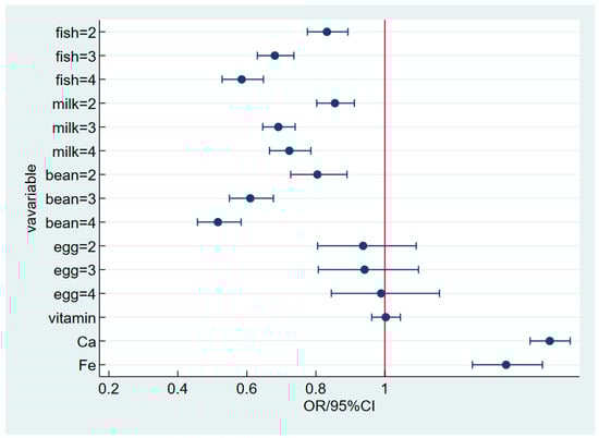 The results of univariate regression showed that the consumption of fish, milk, eggs, and soy products was significantly negatively correlated with the severity of menopausal symptoms. Additionally, the use of nutrient supplements was significantly positively correlated with menopausal symptoms. Multivariate regression analysis (Table 3; Figure 3) revealed that the intake of fish, milk, and soy products was significantly negatively correlated with the severity of menopausal symptoms (OR < 1, p < 0.001). Furthermore, as the frequency of fish and soy product consumption increased, the probability of alleviating the severity of menopausal symptoms also increased (OR values gradually decreased), as shown in Figure 2. No significant correlation was observed between egg consumption and menopausal symptoms. Moreover, individuals who used calcium and iron nutrient supplements had a significantly higher probability of experiencing worsened menopausal symptoms compared to those who did not use these supplements, with an increase of 48% (ORadjust = 1.48, p < 0.001) and 35% (ORadjust = 1.35, p < 0.001), respectively.