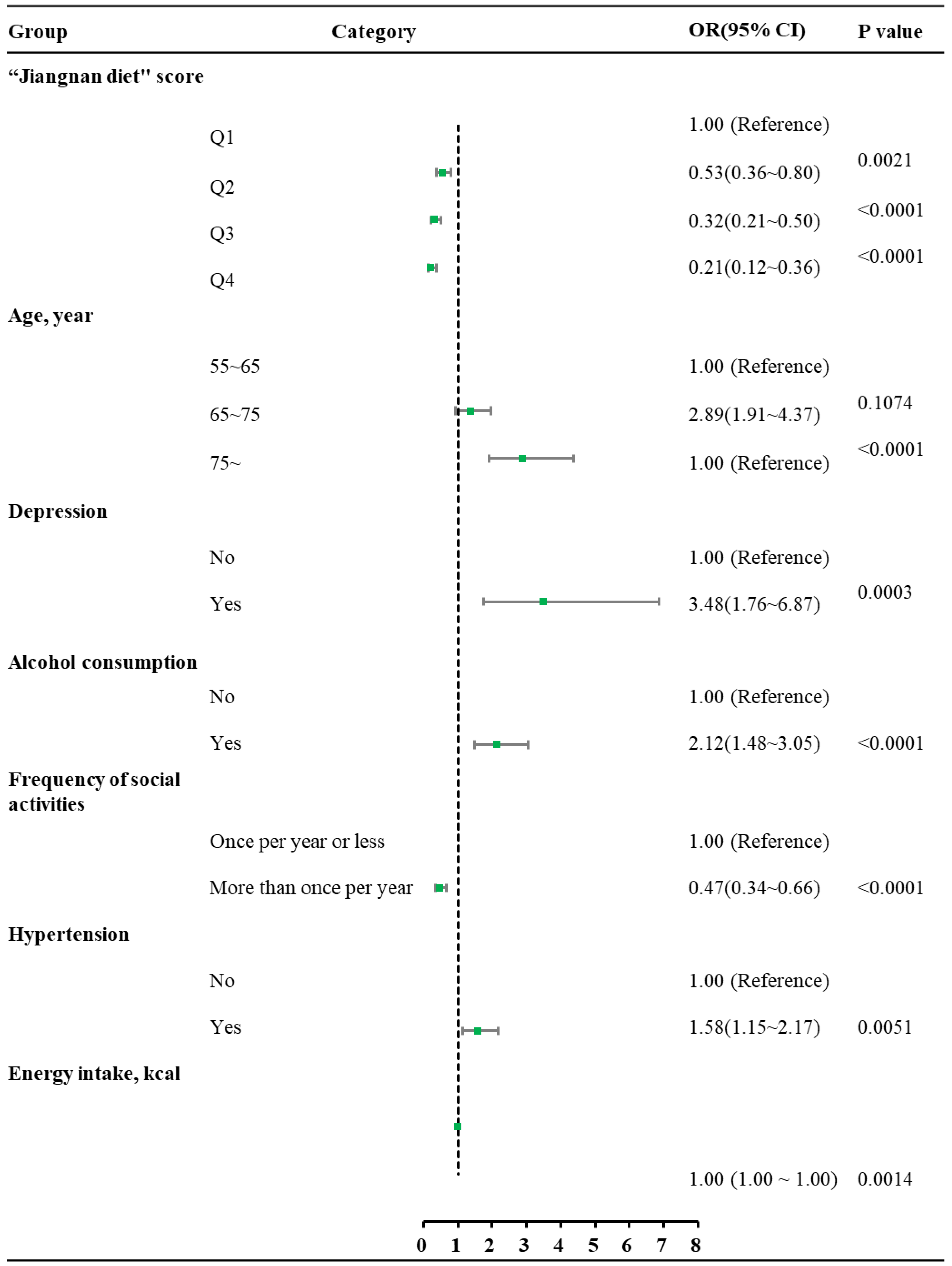 APA StyleHe, M., Zou, Y., Zhang, R., Su, D., & Xu, P. (2025). Association Between the Jiangnan Diet and Mild Cognitive Impairment Among the Elderly. Nutrients, 17(20), 3189. https://doi.org/10.3390/nu17203189