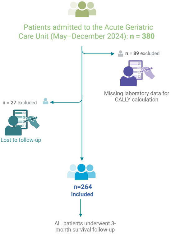 This was a retrospective, observational, single-center study conducted at the acute Geriatric Care Unit of Santa Maria della Misericordia Hospital in Perugia, Italy, between May and December 2024. The study population included individuals aged 65 years and older admitted to the unit during this period. Eligibility criteria required that participants undergo routine laboratory assessments including complete blood count, C-reactive protein (CRP), and serum albumin—parameters essential for calculating the CALLY index. Additionally, participants needed to be reachable for a structured telephone follow-up three months after hospital discharge. Patients who were unable to provide informed consent were excluded from the study. Of the 380 individuals initially screened, 264 were included in the final analysis. Patients were excluded if any of the laboratory values necessary for CALLY index calculation (serum albumin, lymphocyte count, or CRP) were missing or if follow-up information could not be obtained (Figure 1). A three-month survival endpoint was chosen as it captures short-term outcomes that are clinically meaningful in acute geriatric care, allowing sufficient time for post-discharge complications to manifest while minimizing confounding from unrelated long-term events.