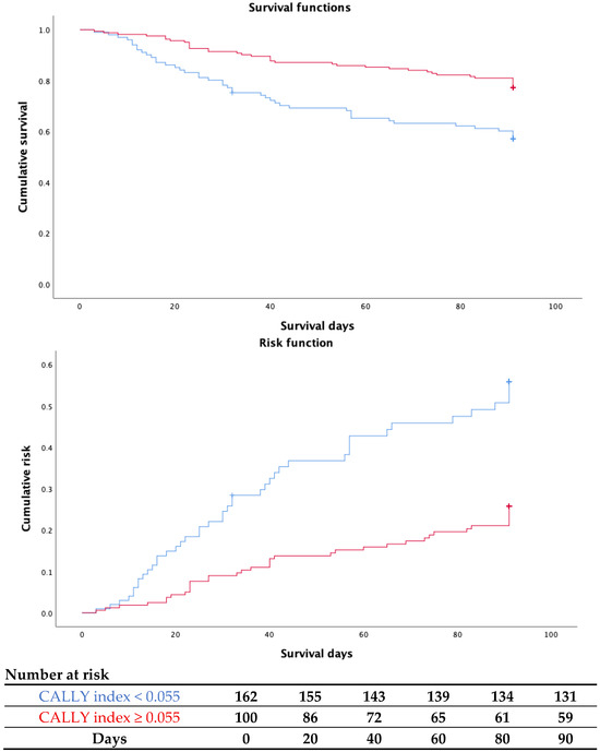 Cumulative survival and risk functions stratified by CALLY index scores. Red: CALLY index ≥ 0.055; Blue: CALLY index < 0.055.