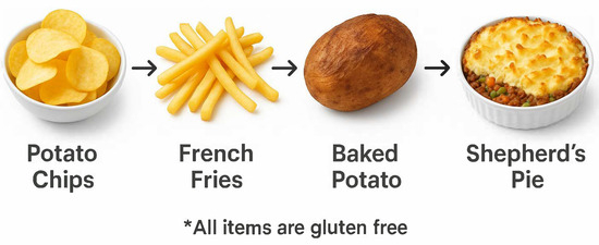 - McDermid, J.M.; Almond, M.A.; Roberts, K.M.; Germer, E.M.; Geller, M.G.; Taylor, T.A.; Sinley, R.C.; Handu, D. Celiac Disease: An Academy of Nutrition and Dietetics Evidence-Based Nutrition Practice Guideline. J. Acad. Nutr. Diet. 2023, 123, 1793–1807.e4. [Google Scholar] [CrossRef] [PubMed]