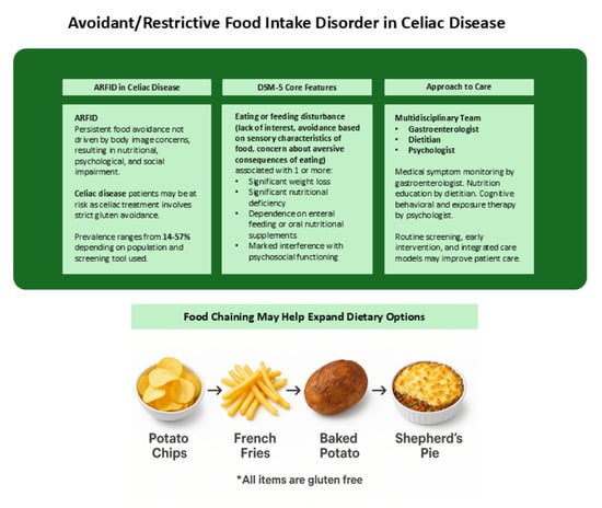 Given the rising prevalence of ARFID and its significant medical complications and psychosocial impacts in both adult and pediatric populations, its early identification and management is necessary. A multidisciplinary team should be assembled to treat patients with ARFID and CeD. Key multimodal approaches include regular monitoring of medical symptoms and complications by primary care physicians and gastroenterologists, education on a healthy GFD, which may include structured meal plans by dietitians, and therapies like Cognitive Behavioral Therapy (CBT) and exposure therapy directed by psychologists [