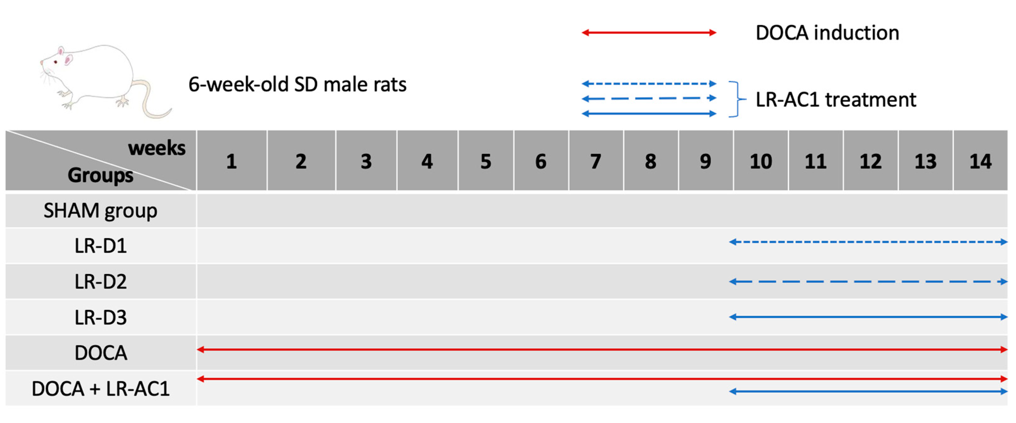 In this study, deoxycorticosterone acetate (DOCA), an adrenocortical hormone and corticosteroid used clinically to treat primary adrenal insufficiency and inflammation, was employed as a model to induce hypertension [