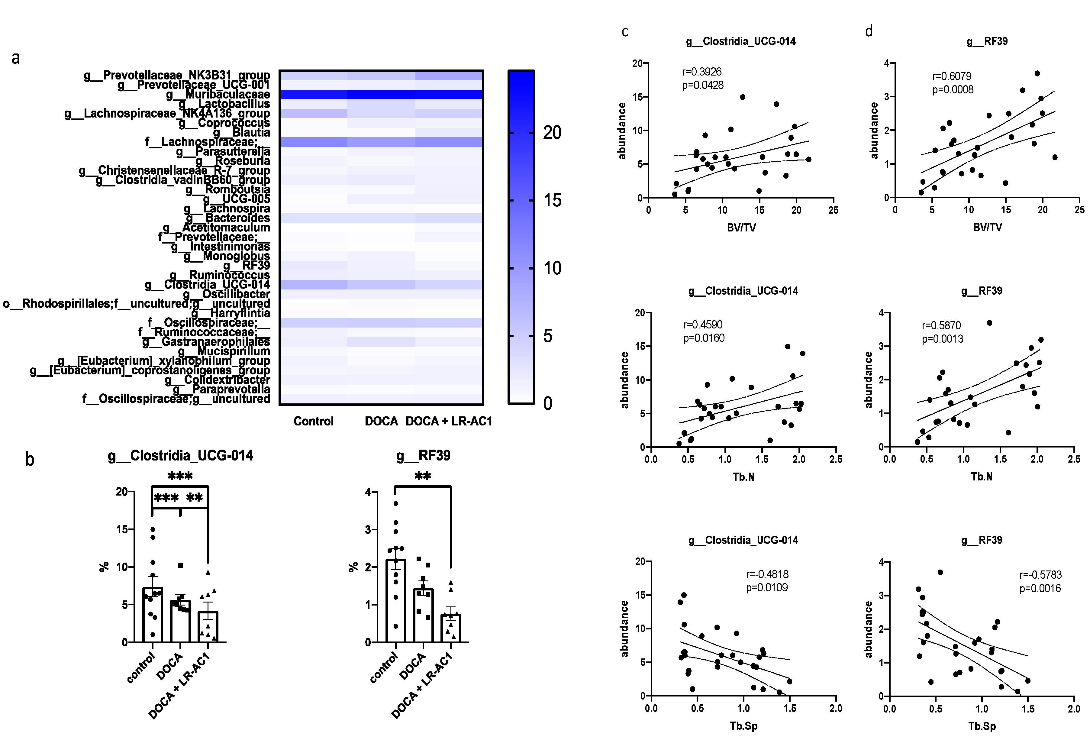 Clostridia-UCG-014 followed a trend consistent with bone loss. Therefore, treatment with live LR-AC1 in DOCA-salt-induced osteoporosis altered the composition of the gut microbiota and reduced the relative abundance of