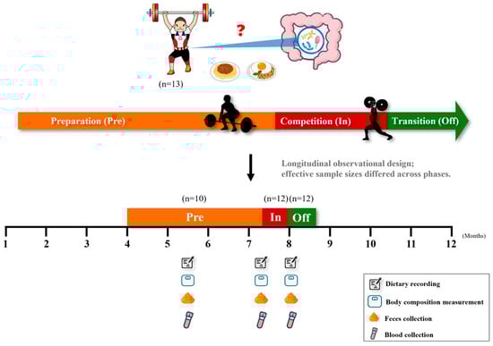 Study design and sample collection across training phases. Thirteen competitive weightlifters were enrolled and followed longitudinally across three training phases: preparation (Pre), competition (In), and transition (Off). At each phase, dietary records, body composition, fecal samples, and blood samples were collected. Effective sample sizes differed across phases due to incomplete data (Pre = 10, In = 12, Off = 12).