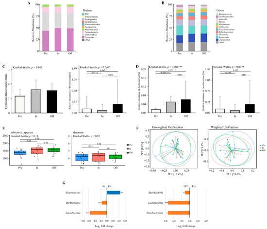 The diversity and composition of the gut microbiome across training phases. (A,B) The relative abundance of major bacterial taxa at the (A) phylum and (B) genus levels across three training phases. (C) Firmicutes to Bacteroidetes (F/B) ratio and the relative abundance of Fusobacteria at the phylum level. Only Fusobacteria exhibited a significant difference across phases. (D) Relative abundance of genera with significant phase-specific differences, including Burkholderia and Fusobacterium. (E) Alpha diversity assessed by observed species and Shannon index. (F) Beta diversity visualized using principal coordinate analysis (PCoA) based on unweighted UniFrac and weighted UniFrac distances. Explained variance of PC1 and PC2 is indicated as percentages on each axis. * p < 0.05, ** p < 0.01, *** p < 0.001. (G) Differential abundance of bacterial taxa between Pre vs. In and Pre vs. Off phases. Taxa with Benjamini–Hochberg corrected p-value below 0.05 are shown. * padj < 0.05, ** padj < 0.01, *** padj < 0.001. Preparation (pre, n = 10), Competition (in, n = 12), Transition (off, n = 12).