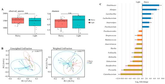 The diversity and composition of the gut microbiome across weight classes. (A) Alpha diversity assessed by observed species and Shannon index. (B) Beta diversity visualized using principal coordinate analysis (PCoA) based on unweighted UniFrac and weighted UniFrac distances. Explained variance of PC1 and PC2 is indicated as percentages on each axis. * p < 0.05, ** p < 0.01, *** p < 0.001. (C) Differential abundance of bacterial taxa between heavy and light weight classes. Taxa with Benjamini–Hochberg corrected p-value below 0.05 are shown. * padj < 0.05, ** padj < 0.01, *** padj < 0.001. Data were derived from the preparation, competition, and transition phases. A total of 34 datasets were originally available. After excluding one athlete who did not provide competition-phase samples (and the corresponding preparation and transition data), 31 valid datasets remained: lightweight (n = 18) and heavyweight (n = 13).