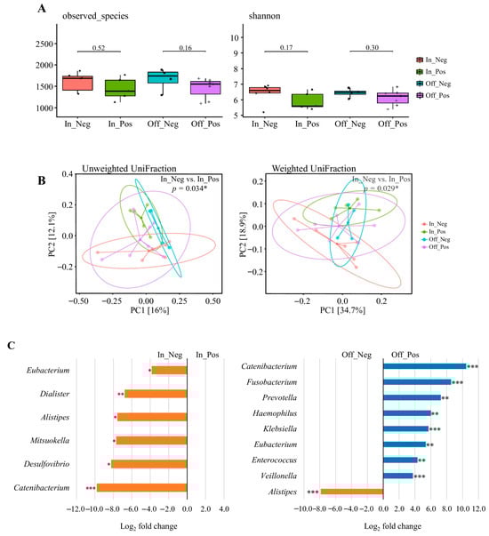 Beta diversity was assessed using principal coordinates analysis (PCoA) based on unweighted and weighted UniFrac distances (Figure 4B). Significant separation between In_Pos and In_Neg for both unweighted (p = 0.034) and weighted (p = 0.029) UniFrac metrics, indicating that the direction of pre-competition weight change was associated with compositional shifts in the gut microbiota. By contrast, no significant differences were observed between Off_Pos and Off_Neg (all p > 0.05), suggesting that post-competition weight fluctuations had a lesser impact on overall community structure.