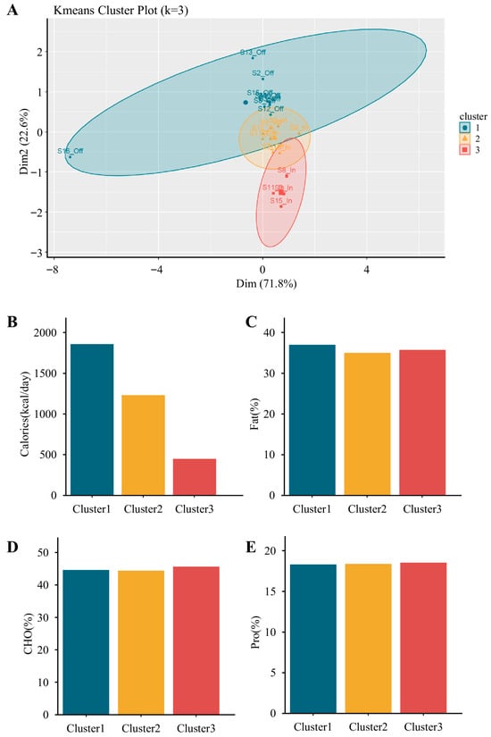 K-means clustering of participants based on energy and macronutrient intake profiles. (A) K-means cluster plot (k = 3) visualizing three distinct dietary clusters from paired competition and transition phases (originally n = 24, reduced to n = 22 after excluding one athlete missing competition data and one missing transition data). (B–E) Comparisons of dietary intake characteristics among clusters, including (B) total energy intake (kcal/day), (C) fat (% of total energy), (D) carbohydrate (% of total energy), and (E) protein (% of total energy). Cluster 1 (n = 10) was characterized by the highest caloric intake, Cluster 2 (n = 8) showed moderate intake, and Cluster 3 (n = 4) showed the lowest. Macronutrient distribution appeared similar across clusters, except for total energy.