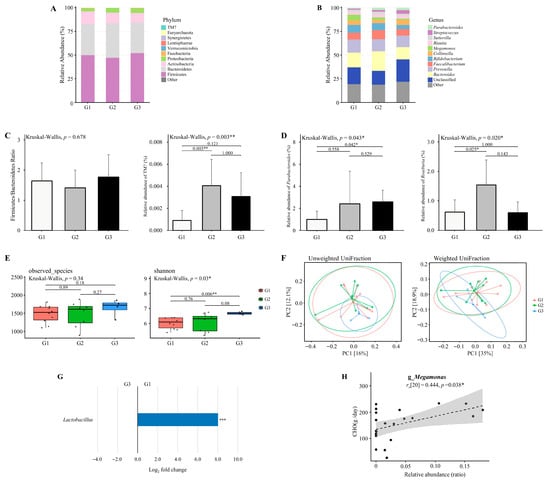 Alpha diversity analysis revealed a significantly higher Shannon index in the low-calorie group (G3) compared to the high-calorie group (G1) (p = 0.006; Figure 6E). However, beta diversity analysis based on weighted and unweighted UniFraction distances showed no significant clustering (p > 0.05; Figure 6F).
