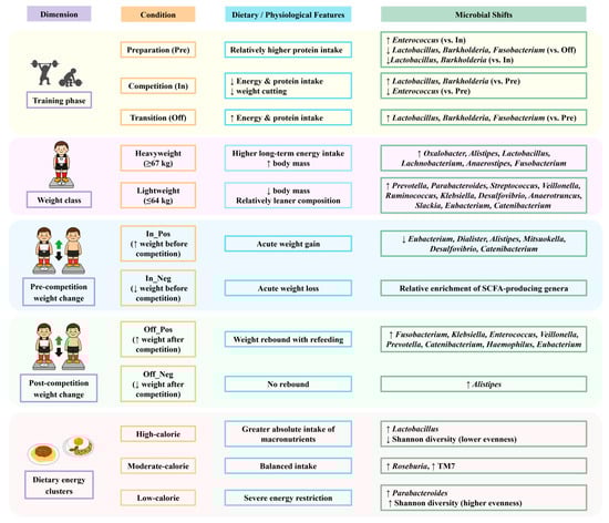 Summary of gut microbiota shifts in relation to training phases, weight classes, weight changes, and dietary intake clusters in competitive weightlifters. Arrows indicate relative increases (↑) or decreases (↓) in bacterial genera.