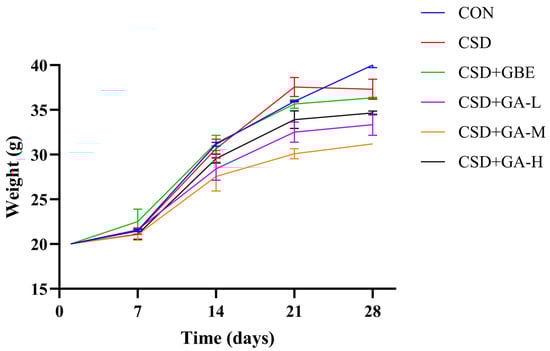 Body weight increased progressively in all groups during the 28-day observation period (Figure 2). In the pre-intervention phase (Days 0–14), no significant differences were observed among the groups. After the onset of CSD modeling (Days 14–28), the CSD group showed a markedly slower rate of weight gain relative to the control group. The CSD+GBE group maintained a trajectory close to that of the control group, indicating that GBE attenuated the stress-induced suppression of body weight gain and helped preserve a stable growth curve under chronic stress conditions. In the GA-treated groups, the slopes of body weight gain were broadly similar during this period; however, the overall changes did not follow a strictly linear dose–response. Specifically, the GA-M group showed lower mean body weight than GA-L, whereas GA-H partially recovered toward the GA-L level. This non-linear pattern suggests that GA administration did not exert a monotonic effect on body weight and that its more consistent effects were reflected in the behavioral and biochemical outcomes rather than in the growth parameters.