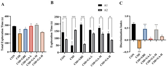 In the NOR test, the CSD mice exhibited a marked reduction in total exploration time compared with the CON group (Figure 4A, ## p < 0.01), indicating impaired exploratory activity. Treatment with GA (50–100 mg/kg) or GBE significantly increased the total exploration time relative to the CSD mice (* p < 0.05, ** p < 0.01), suggesting a partial restoration of exploratory drive.