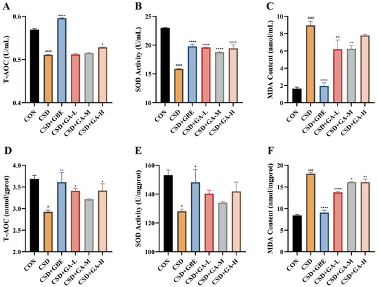 Effects of GA on oxidative stress indices in serum and in the hippocampus of the CSD mice. (A–C) Serum T-AOC, SOD activity, and MDA content. (D–F) Hippocampal T-AOC, SOD activity, and MDA content. Results are shown as the mean ± SEM (n = 12). # p < 0.05, ### p < 0.001 and #### p < 0.0001 vs. CON; * p < 0.05, ** p < 0.01, and **** p < 0.0001 vs. CSD.