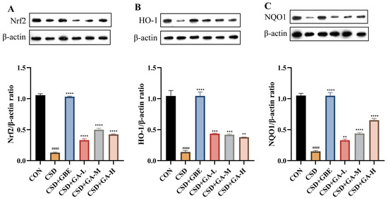 Serum cytokine concentrations in the CSD mice after GA administration. (A) Nrf2/β-actin; (B) HO-1/β-actin; (C) NQO1/β-actin. Results are shown as the mean ± SEM (n = 3). #### p < 0.0001 vs. CON; ** p < 0.01, *** p < 0.001 and **** p < 0.0001 vs. CSD.