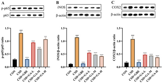Expression of NF-κB (p65), iNOS, and COX2 in the hippocampus of the CSD mice after GA administration. (A) p-p65/p65; (B) iNOS/β-actin; (C) COX-2/β-actin. Results are shown as the mean ± SEM (n = 3). #### p < 0.0001 vs. CON; *** p < 0.001 and **** p < 0.0001 vs. CSD.