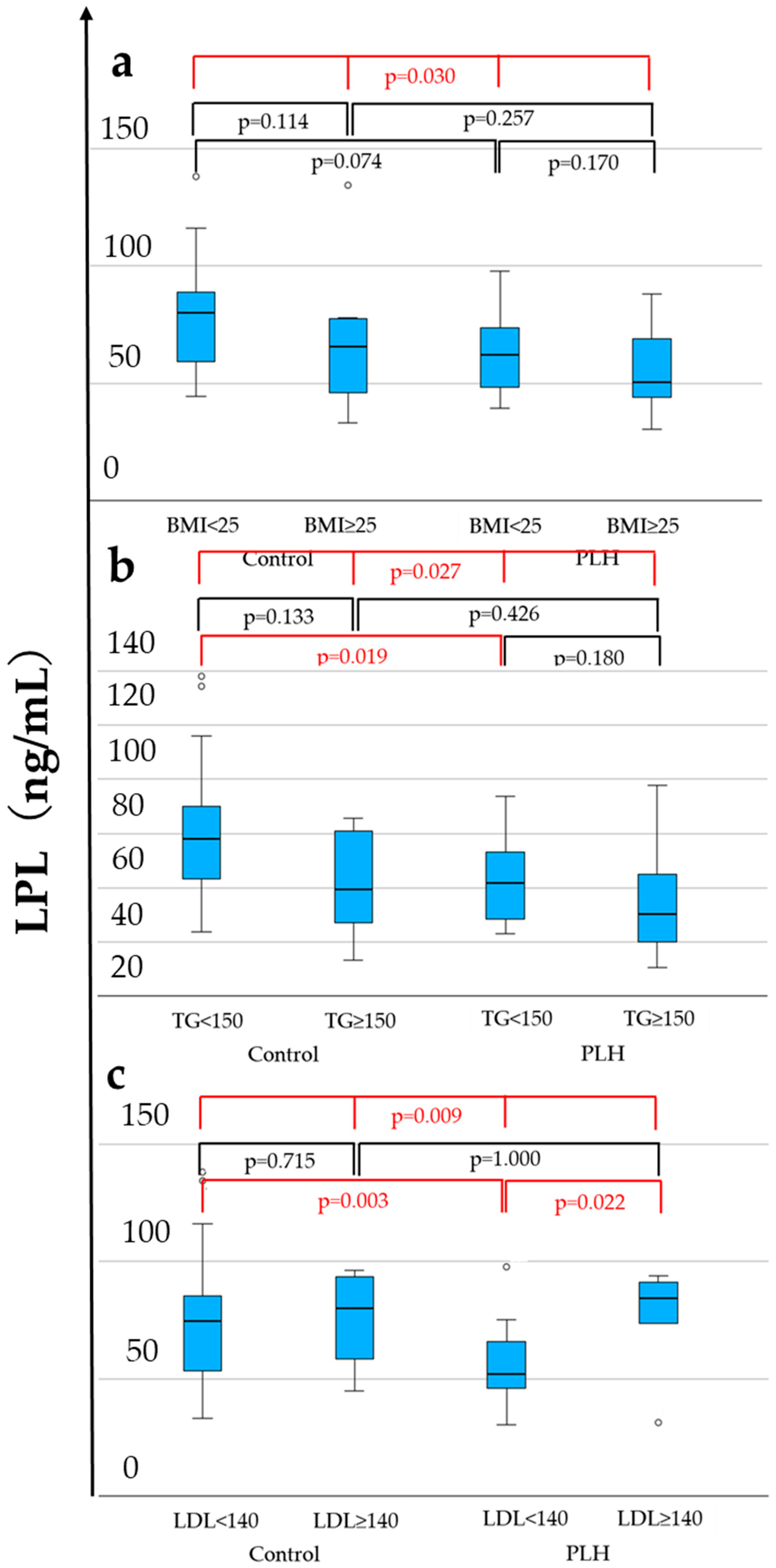 LPL (ng/mL) | 75.1 | (53.3–86.9) | 65.5 | (46.6–79.5) | 0.168 | 65.5 | (49.8–76.4) | 56.5 | (42.2–90.1) | 0.651 |