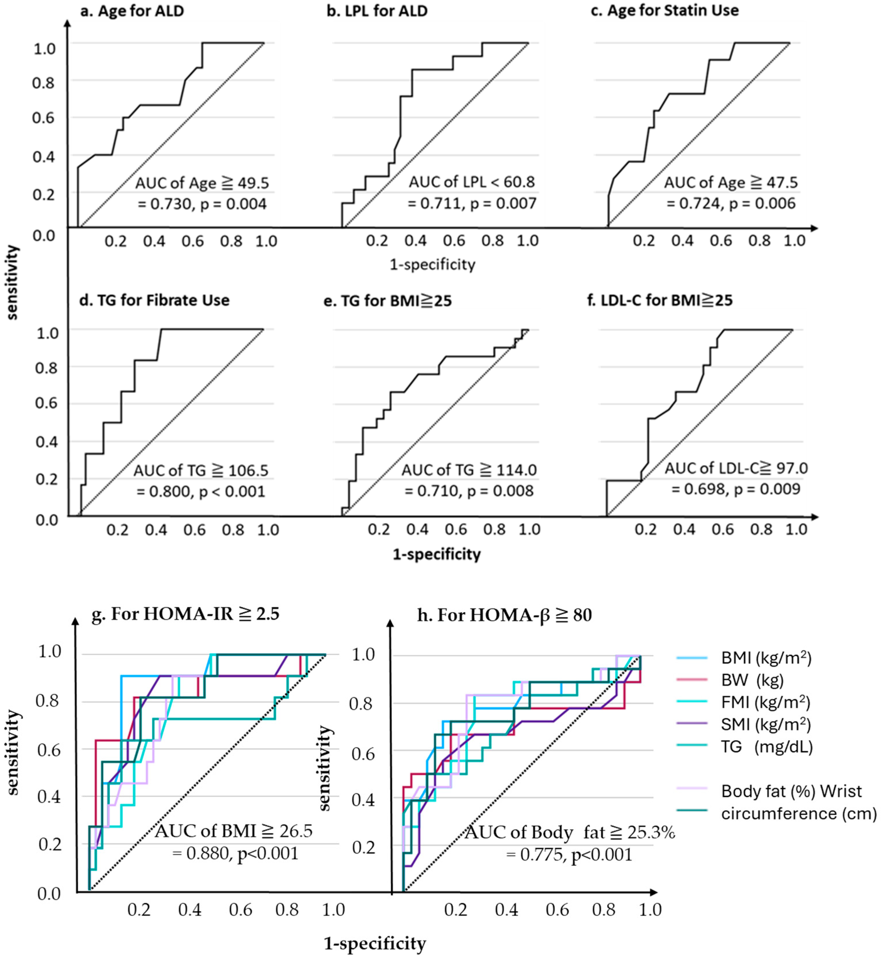 - Nagasawa, T.; Sakamaki, K.; Yoshida, A.; Machida, H.; Murakami, F.; Hashimoto, M.; Shinohara, T.; Murakami, M.; Tsunekawa, K.; Kimura, T. Reciprocal Fluctuations in Lipoprotein Lipase, Glycosylphosphatidylinositol-Anchored High-Density Lipoprotein-Binding Protein 1, and Hepatic Triglyceride Lipase Levels in the Peripheral Bloodstream Are Correlated with Insulin Resistance. Nutrients 2025, 17, 1880. [Google Scholar] [CrossRef]