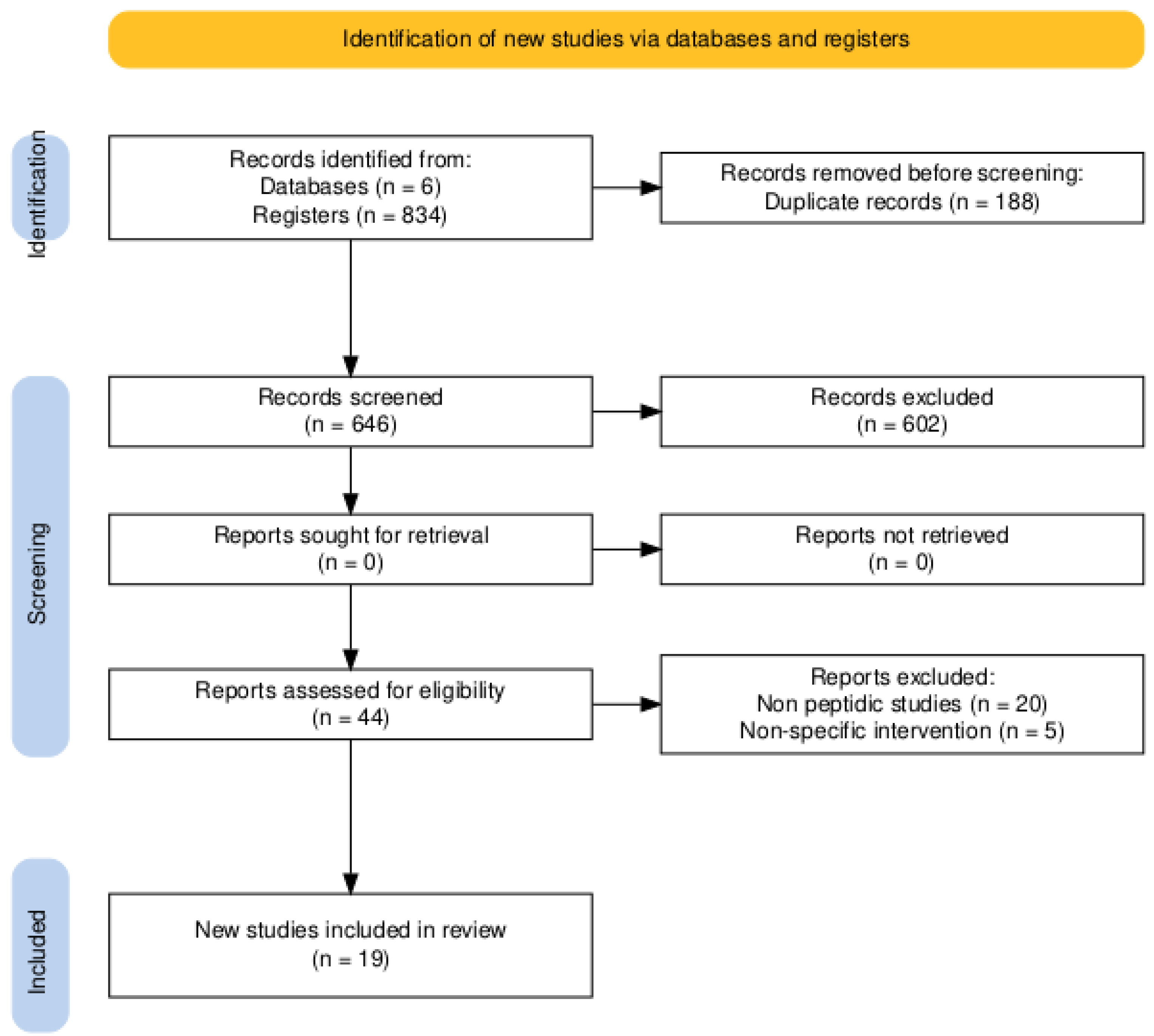 The study selection process is summarized in the PRISMA flow diagram (Figure 1). The initial database search identified 834 records. Following the removal of 188 duplicates, 646 titles and abstracts were screened, of which 602 were excluded as they were not relevant. The full texts of 44 articles were assessed for eligibility, and 25 were subsequently excluded for not meeting the inclusion criteria (e.g., focusing on non-peptidic compounds or lacking relevant microbiome outcomes). Ultimately, 19 primary experimental studies were included in the qualitative synthesis. A strong inter-rater agreement was achieved, with a Cohen’s Kappa of 0.8 for the title and abstract screening and 0.9 for the full-text eligibility assessment.