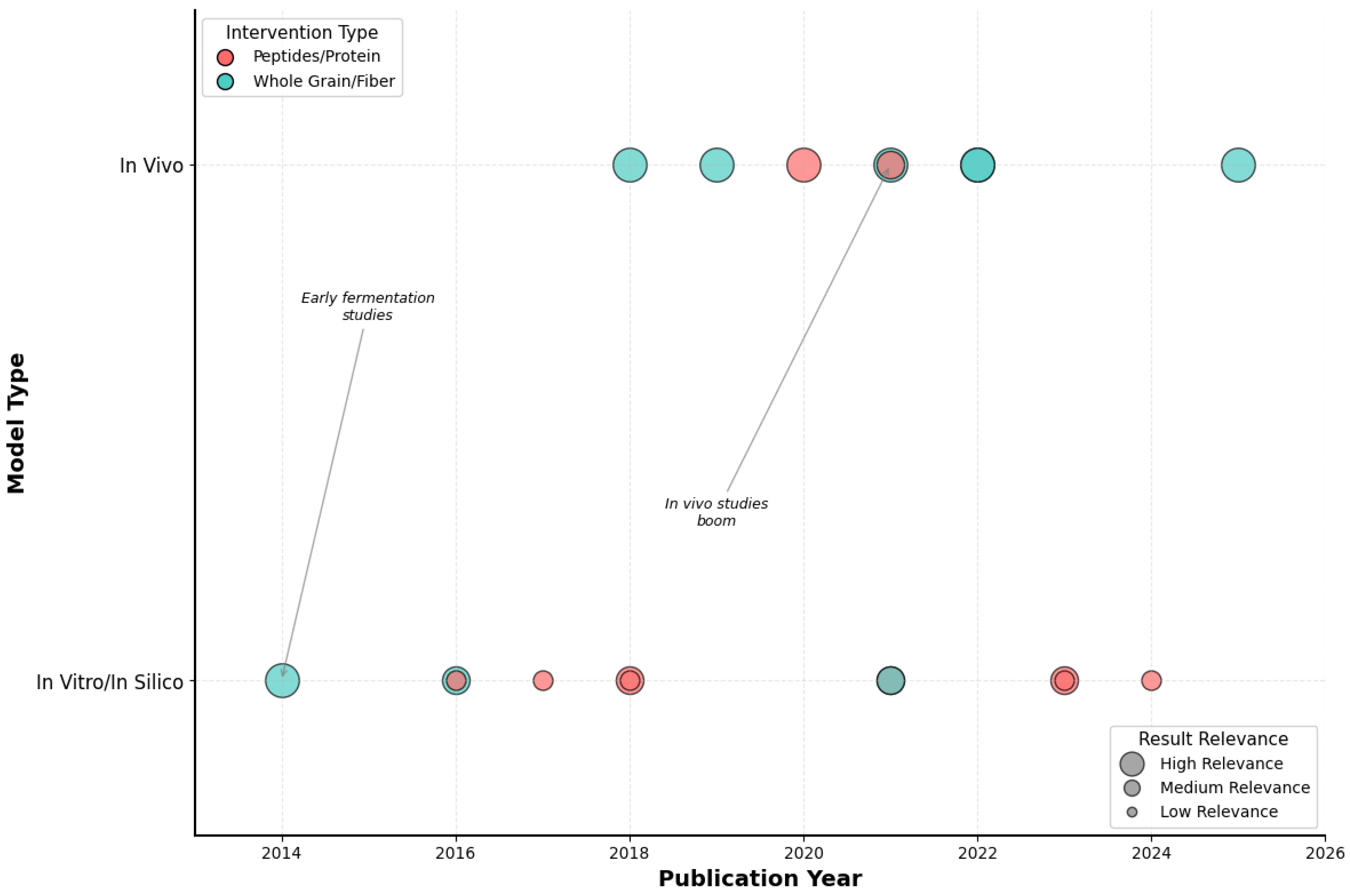 Figure 2. Temporal distribution of included studies by experimental model and intervention type. Bubble plot showing the evolution of quinoa-related studies according to publication year (x-axis) and model type (y-axis). Bubble colors represent the type of intervention (red = peptides/protein, blue = whole grain/fiber), while bubble sizes reflect the relative relevance of results (large = high, medium = medium, small = low). Early research focused on in vitro fermentation studies, whereas a marked increase in in vivo studies is observed from 2020 onwards. Source: own elaboration.