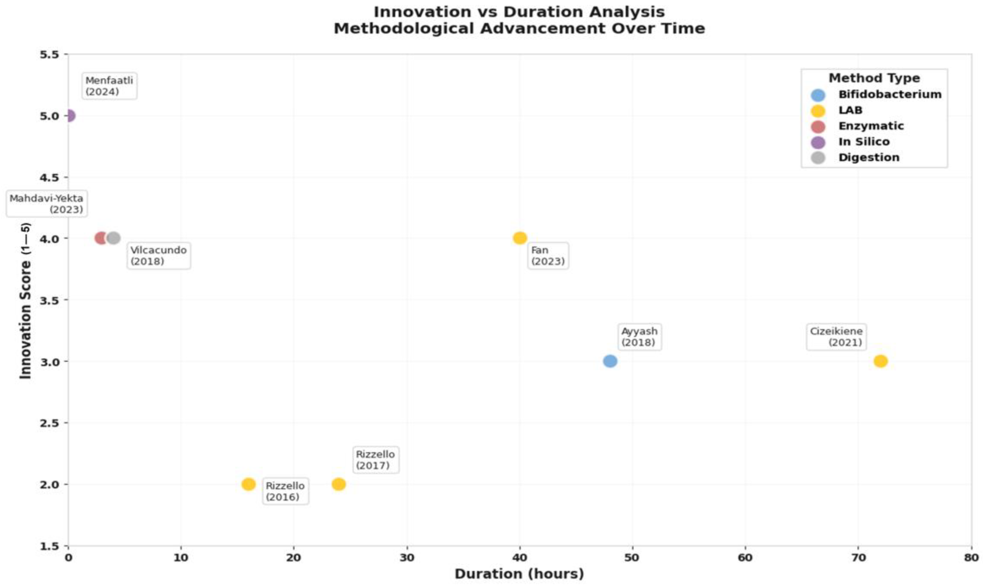 The innovation versus duration analysis (Figure 6) illuminates an emerging technological frontier. Studies achieving the highest innovation scores (4–5 out of 5) consistently integrate multiple validation approaches: Fan et al. (2023) [33] combined fermentation with digestive stability testing, while Menfaatli et al. (2024) [35] linked computational prediction with experimental validation. This methodological convergence suggests the field is evolving toward integrated platforms that balance efficiency, functionality, and practical applicability.