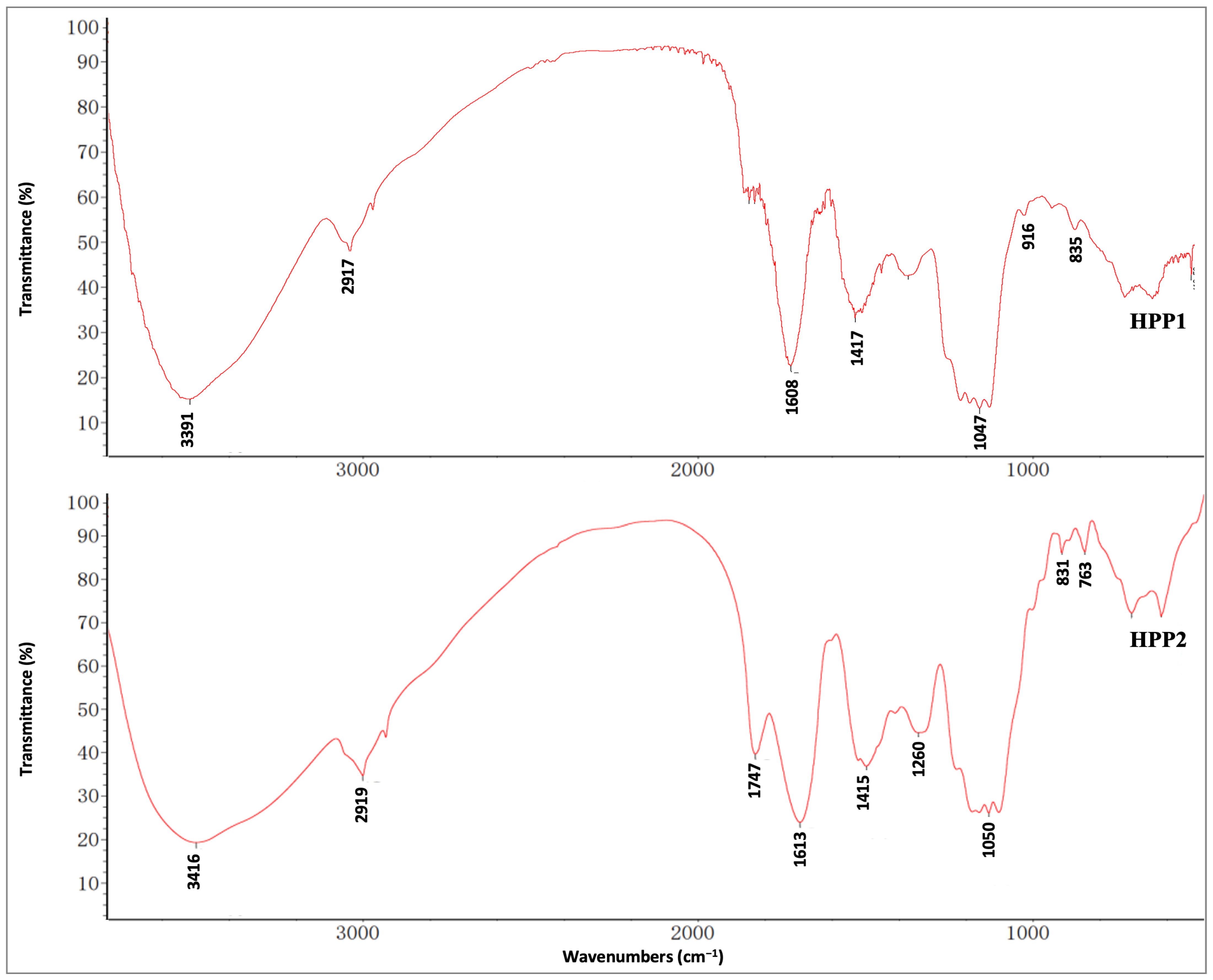 2.1. Extractions and Physicochemical Characteristics of HPP1 and HPP2