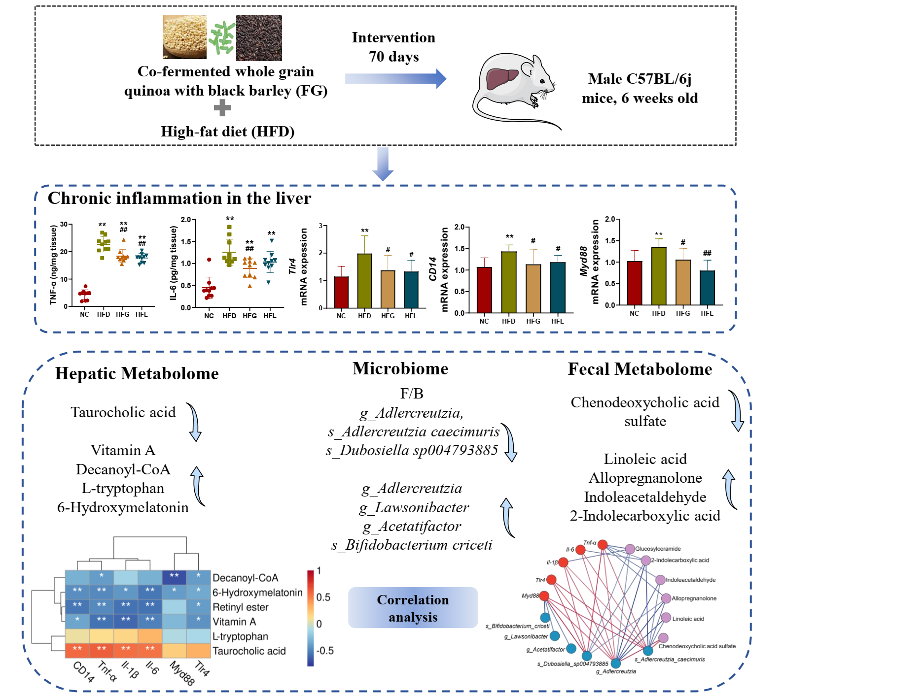 Wei, F.; Jiang, H.; Zhu, C.; Zhong, L.; Lin, Z.; Wu, Y.; Song, L. Co-Fermented Black Barley and Quinoa Alleviate Hepatic Inflammation via Regulating Metabolic Disorders and Gut Microbiota in Mice Fed with High-Fat Diet. Nutrients 2025, 17, 3228. https://doi.org/10.3390/nu17203228