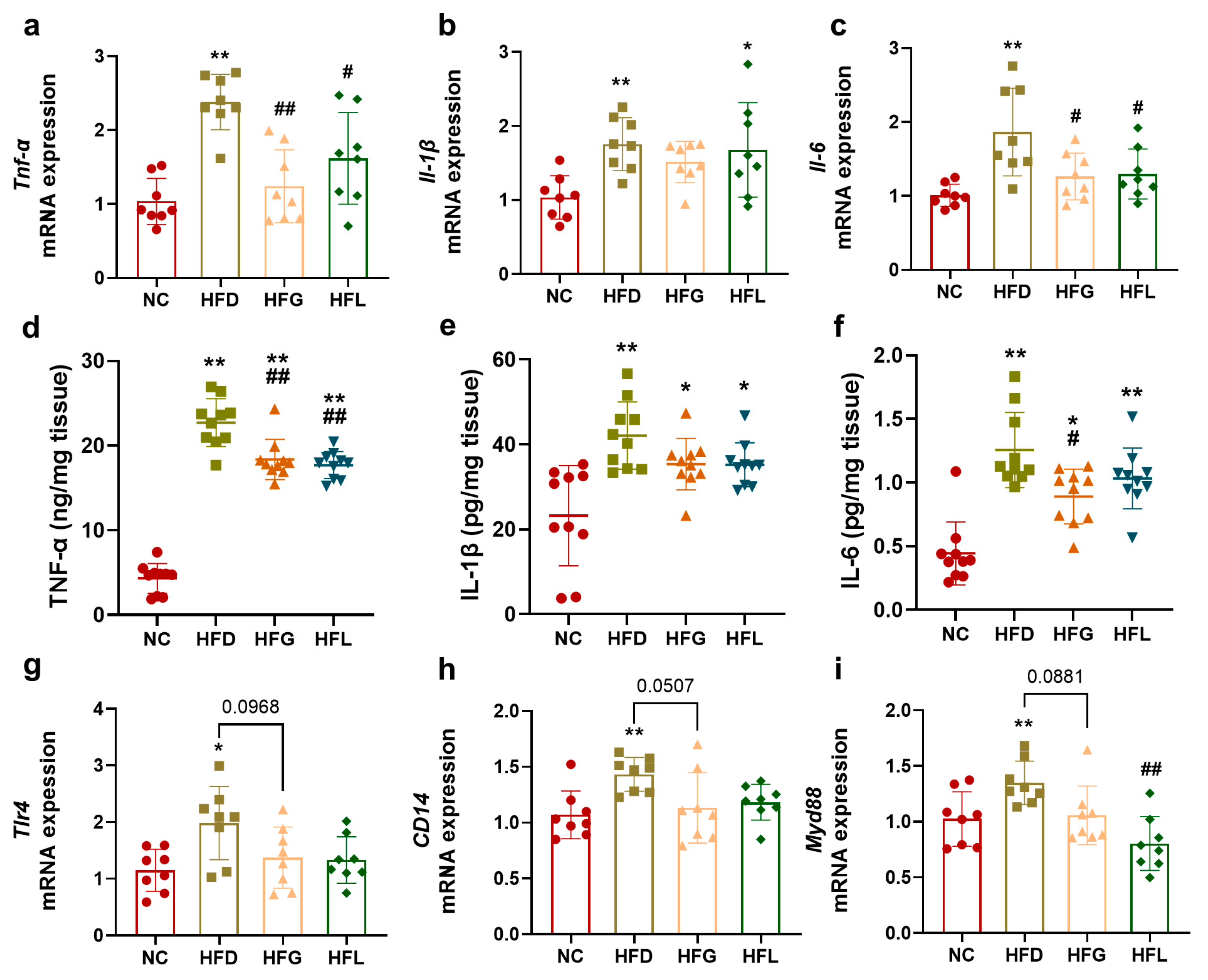 4.1. FG Ameliorated Hepatic Chronic Inflammation Induced by Long-Term HFD