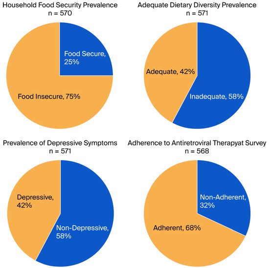 Our study identified significant vulnerability among the participants: 75% (95% CI:71.5–78.6) resided in food-insecure homes. Fifty-eight per cent of women (95% CI:53.5–61.6) had inadequate dietary diversity, while forty-two per cent (95% CI:38.4–46.5) experienced depressive symptoms. Sixty-eight percent (95% CI: 64.4–72.0) adhered to antiretroviral therapy (ART) (Figure 1).