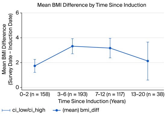 Changes were observed in post-induction BMI peaks at 3–6 years, with declining trends thereafter. The mean BMI difference (after–before) was greatest in the 3–6 year window (~3.4 units (95%CI: 2.69–3.94)), with slightly smaller but overlapping increases at 7–12 years (3.17; 95%CI: 2.35–3.99) and a reduced change by 13–20 years (2.12; 95%CI: 0.47–3.77). Confidence intervals indicate some uncertainty in the later periods, meaning that long-term trends should be interpreted with caution (Figure 2).