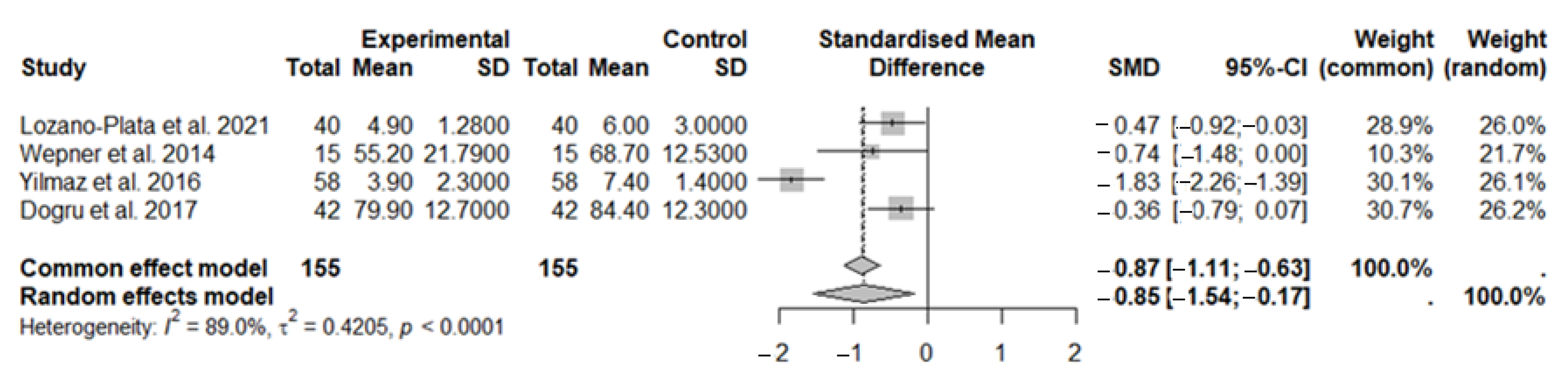 - Higgins, J.P.T.; Thompson, S.G.; Deeks, J.J.; Altman, D.G. Measuring Inconsistency in Meta-Analyses. BMJ 2003, 327, 557–560. [Google Scholar] [CrossRef]