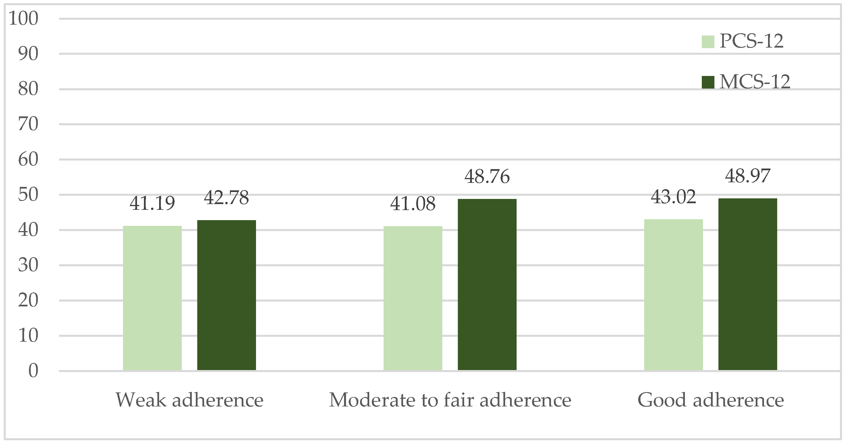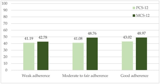 No differences were found in the quality-of-life scores for either dimension (PCS-12, p = 0.336; MCS-12, p = 0.166) according to the categories of good (n = 106), moderate (n = 167), and poor adherence (n = 12) to the Mediterranean diet (Figure 1).