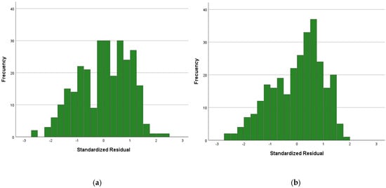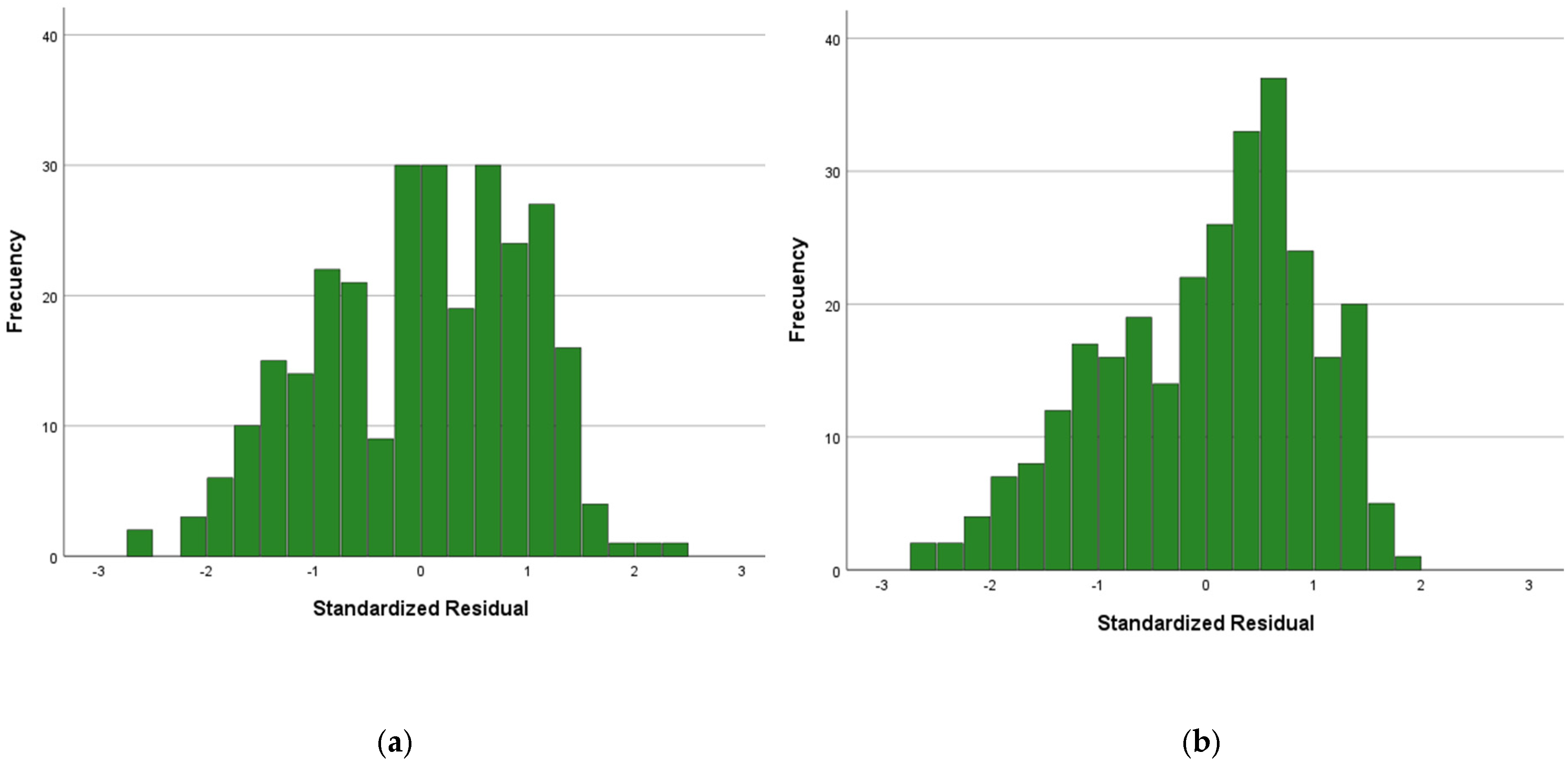 A sensitivity analysis using robust linear regression was performed using PCS-12 and MCS-12 as continuous outcomes, including the variables used in each model as independent variables. For the PCS-12 variable (Figure 2a) and MCS-12 variable (Figure 2b), no standardized residual values outside the ±3 range were observed (Figure 2a,b), and Cook’s distance was 0.004 (SD 0.13) for both models.