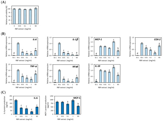 The cytotoxic effects of RBF extract on RAW 264.7 macrophages were evaluated using the MTT assay to identify non-cytotoxic doses for subsequent anti-inflammatory experiments. As shown in Figure 1A, RBF extract concentrations ranging from 0.01 to 1 mg/mL did not affect the viability of LPS-activated macrophages. This indicates that the observed anti-inflammatory effects were not due to cytotoxicity of the extract. In these experiments, macrophages were treated with LPS to stimulate an immune response and promote the release of inflammatory cytokines, as illustrated in Figure 1B.