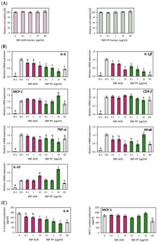 RAW 264.7 macrophages were obtained from the European Collection of Cell Cultures (ECACC, Cat. No 91062702) and cultured in DMEM supplemented with 10% FBS. For experiments, RAW 264.7 cells were seeded onto 24-well plates at an inoculum density of 5 × 105 cells/cm2. After 24 h, the cells were treated with RBF extract at concentrations of 0.01, 0.1, and 1 mg/mL, as well as with RBF-ACN and RBF-PP fractions at concentrations of 0.1, 1, and 10 µg/mL for 1 h. Following this treatment, the cells were stimulated with LPS at a concentration of 1 μg/mL for an additional 3 h.