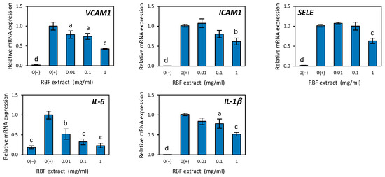 The effect of raspberry fruit (RBF) extract on the expression of inflammatory-related genes in HUVECs treated with TNF-α. The negative control 0(−) was not treated with TNF-α. Data are the mean values ± SD (n = 3). Statistical analysis assessed differences compared to the positive control 0(+), with significant differences indicated as follows: a p ≤ 0.05, b p ≤ 0.01, c p ≤ 0.001, d p ≤ 0.0001.