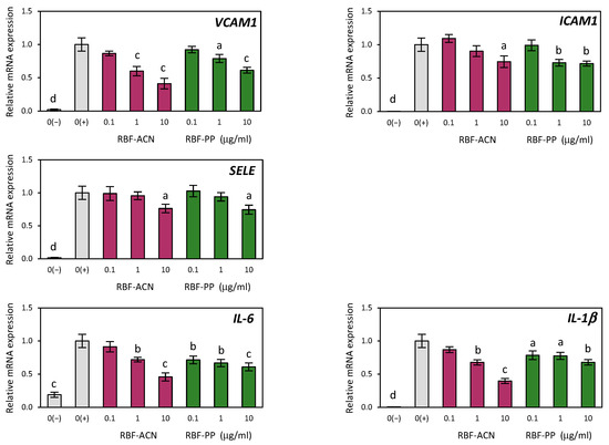 The effects of anthocyanin (RBF-ACN) and non-anthocyanin polyphenol (RBF-PP) fractions on the expression of inflammatory-related genes in HUVECs treated with TNF-α. The negative control 0(−) was not induced by TNF-α. Data are the mean values ± SD (n = 3). Statistical analysis assessed differences compared to the positive control 0(+) with significant differences indicated as follows: a p ≤ 0.05, b p ≤ 0.01, c p ≤ 0.001, d p ≤ 0.0001.