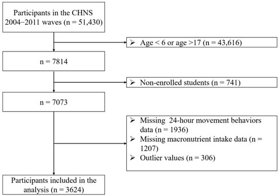 This study uses data from the China Health and Nutrition Survey (CHNS), an ongoing open cohort designed to examine the impact of health, nutrition, and family planning policies implemented by both national and local governments. The CHNS has been conducted since 1989, with follow-ups approximately every 2 to 3 years, the most recent occurring in 2015. A multistage, random cluster sampling method was used to select around 7200 households, including over 30,000 individuals across 15 provinces and municipalities. Additional details about the CHNS are available on the official website (https://chns.cpc.unc.edu/about/design/, accessed on 15 August 2025) and in previously published studies [26]. Since sedentary behavior data in the CHNS were first collected in 2004, and publicly available macronutrient data extend only through 2011, considering the availability of samples in the database and ensuring that participants have complete 24-h movement behavior data, this study analyzed four survey waves covering the period from 2004 to 2011. The survey received approval from the institutional review boards at both the University of North Carolina at Chapel Hill and the National Institute for Nutrition and Health (NIHH) under the China Center for Disease Control and Prevention (CCDC) [27]. All parents provided written informed consent for their children’s participation. Figure 1 presents the flow chart.