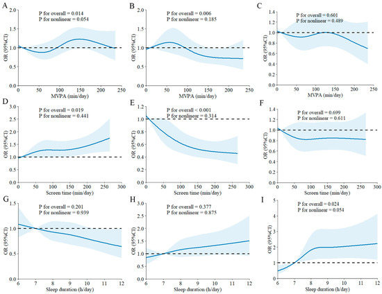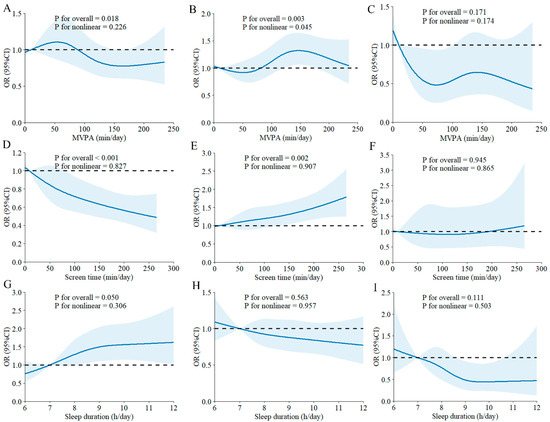 Dose–response associations between 24-h movement behaviors and macronutrient intake above DRIs. (A–C) MVPA with carbohydrate, fat, and protein intakes above DRIs; (D–F) ST with carbohydrate, fat, and protein intakes above DRIs; (G–I) SLP with carbohydrate, fat, and protein intakes above DRIs. The blue line represents the fitted line and the dashed line represents the reference line. Abbreviations: MVPA, moderate-to-vigorous physical activity; DRIs, Dietary Reference Intakes; OR, odds ratio; CI, confidence interval.