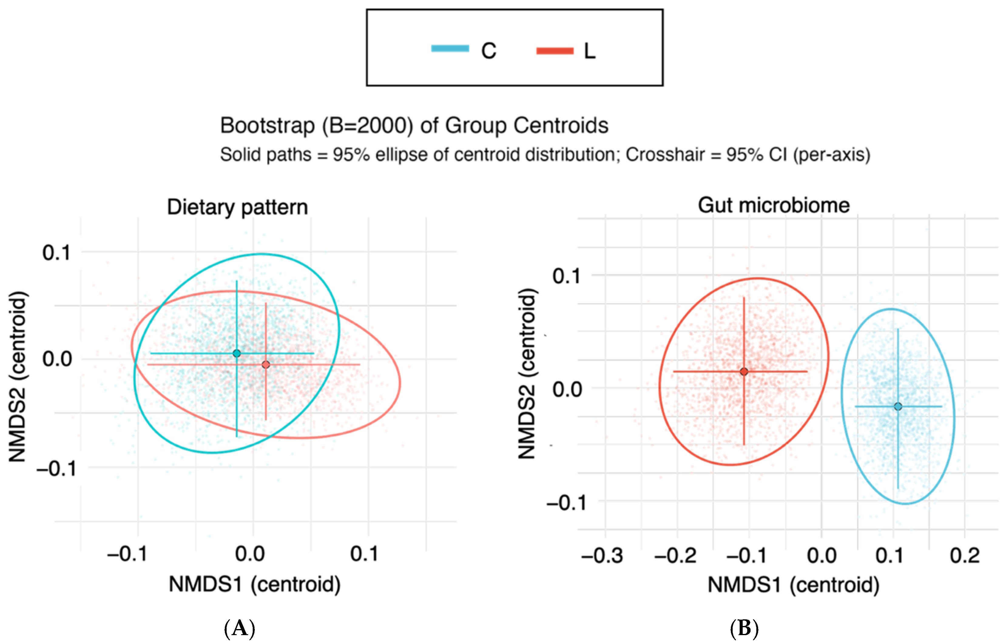 Distance to centroid | Median (BCa 95% CI) | 0.14 (0.11–0.15) | 0.11 (0.087–0.13) | — | — | — | — |