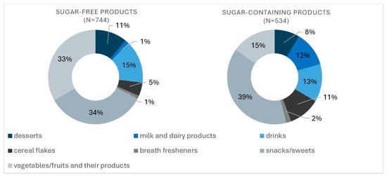 Ultimately, the analysis included 744 products labeled “no added sugar” and 534 products containing added sugar. The sample was classified into seven categories: desserts, milk and dairy products, drinks, cereal flakes, breath fresheners, snacks and sweets, and vegetables/fruits and their dairy products. Figure 1 presents the percentage of products in each category.