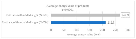 Comparison of the average energy values showed that products with added sugar contained 267.9 kcal/100 g, while products without added sugar contained 212.3 kcal/100 g. This difference was statistically significant (p < 0.0001). The results are presented in Figure 2.